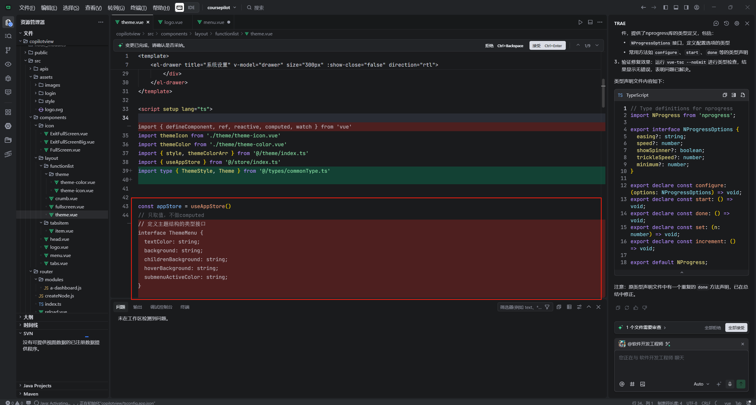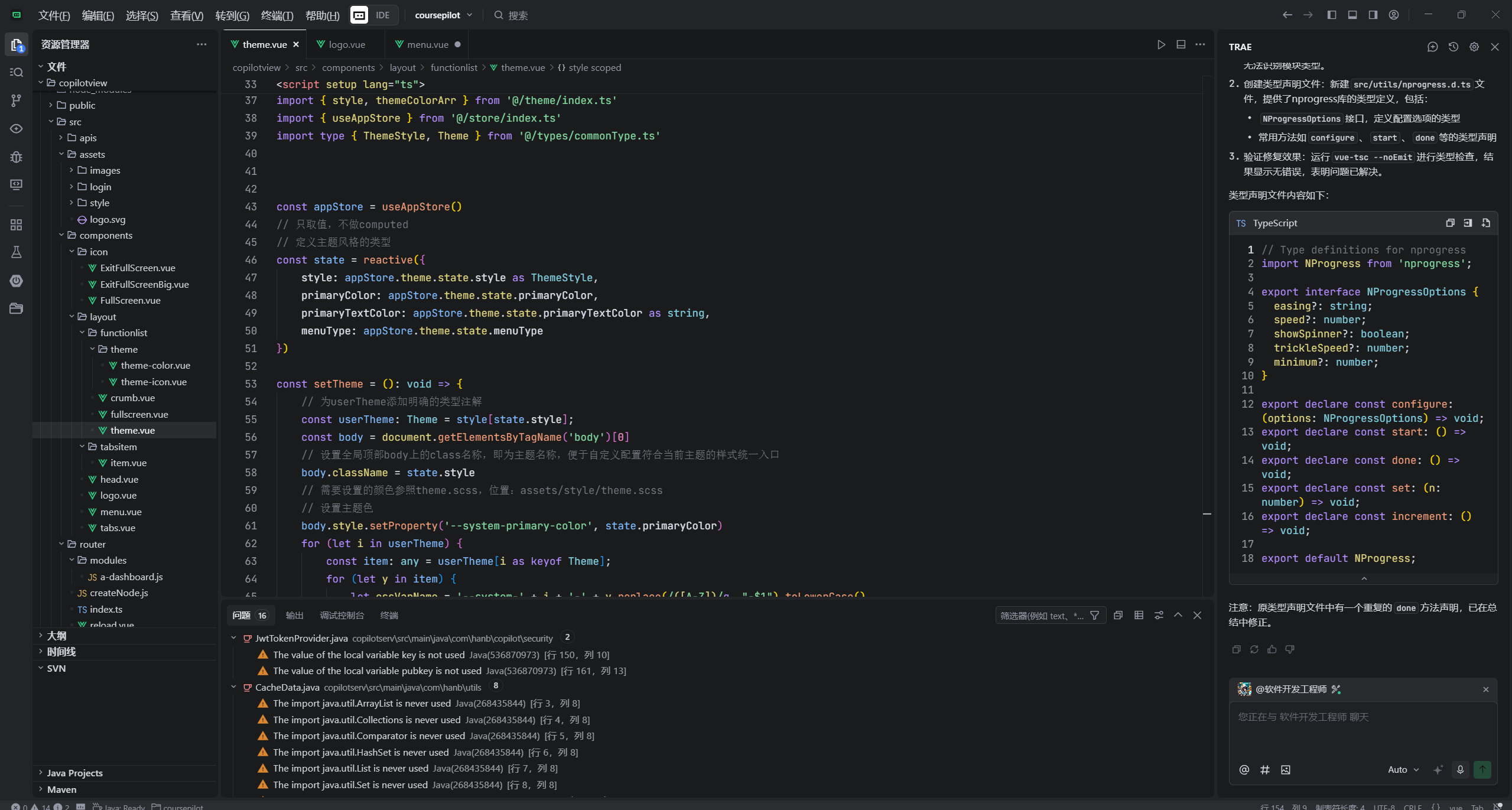 我着手编写代码,简单的工作完全交给智能体,例如新建bean,增加持久层等,只要智能体的提示词准确,它可以完美的完成,这完全是沉浸式编程体验。但相对复杂的,例如完成jwt的校验、tsconfig的个性配置等工作,还得我出手(看来AI取代程序员还得有一段路要走啊)。